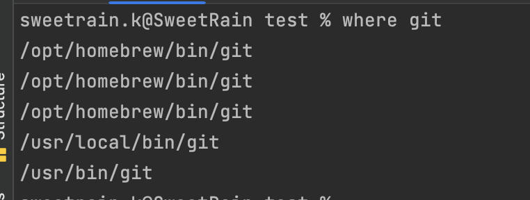 만약 경로를 모른다면 터미널에 where git 을 입력해주면 확인 가능하다!